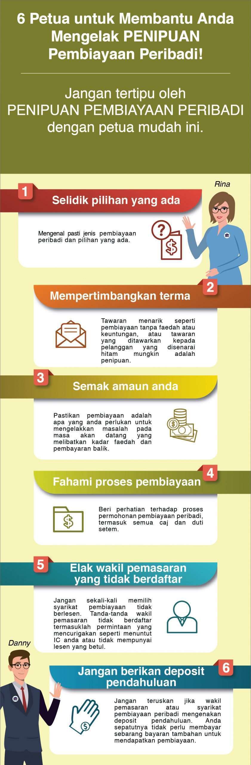 Ianya penting sekiranya ejen/pegawai yang menghubungi anda untuk pembiayaan peribadi mengaku adalah ejen/pegawai dari syarikat pembiayaan terbabit. Hubungi syarikat melalui nombor telefon yang berdaftar pada laman sesawang dan menanyakan adakah syarikat pembiayaan peribadi tersebut ada melantik ejen/pegawai yang berurusan dengan anda.
