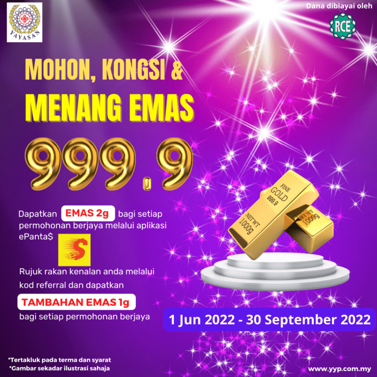 Anda akan dapat emas jika berjaya memohon pembiayaan peribadi melalui aplikasi ePanta$ dalam tempoh 1 Jun 2022 sehingga 30 September 2022! Kongsikan kod referral anda kepada rakan dan keluarga, dapati emas lagi bagi setiap permohonan berjaya menerusi kod referral anda.