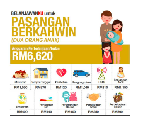Bagi kategori pasangan berkahwin yang mempunyai dua orang anak, panduan tersebut menganggarkan kategori ini memerlukan sebanyak RM6,620 setiap bulan bagi perbelanjaan seperti berikut:
